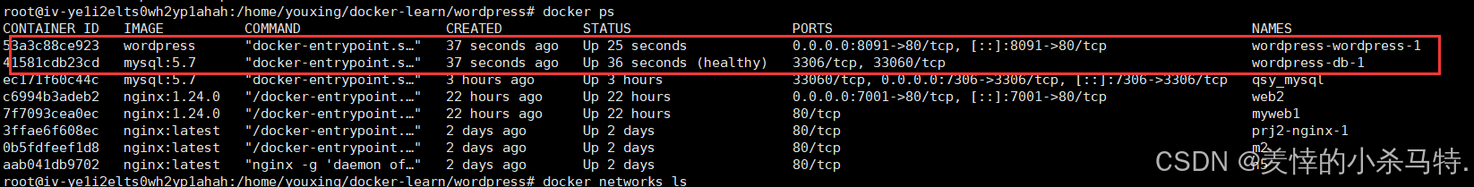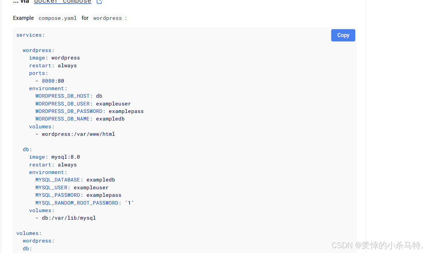 从yml文件可以看出,首先先启动对于的msyql容器(默认为WordPress创建对应管理的库),然后WordPress启动后,就可以拿着mysql容器为它设置的用户名及密码登录区访问对应的数据库,比如当访问对应网站生成的一些信息,就需要去这个数据库查找然后返回,最典型例子就是对应的博客发布(写入库),查看(从库对应位置读取出来),因此说两个容器是互相依赖的。