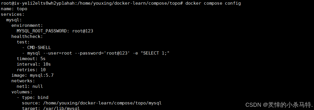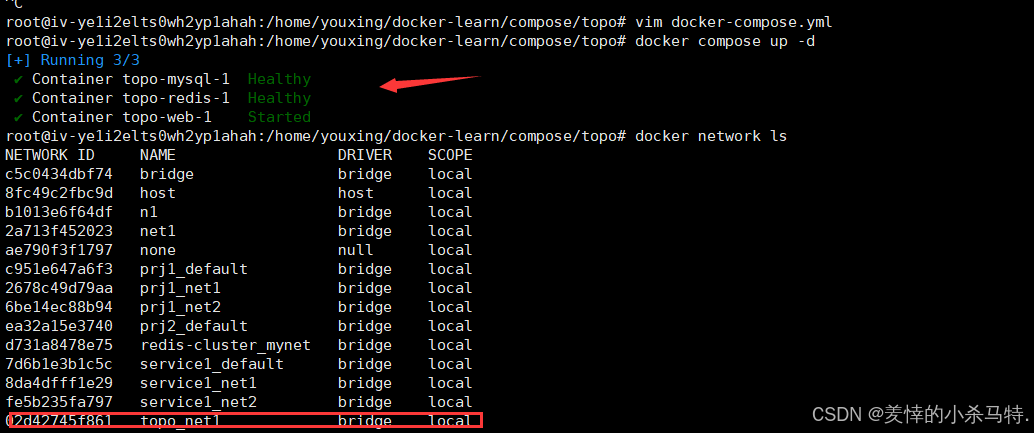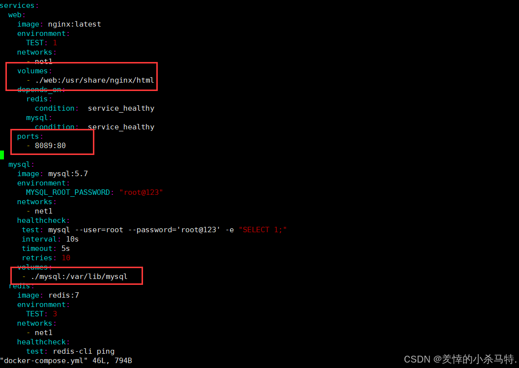 三个服务都加入了同一个叫 net1 的虚拟网络。这样,它们之间就可以直接用服务名(web, mysql, redis)互相访问,非常方便。