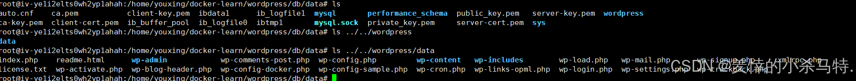 - 发现这里mysql容器对应目录。宿主机的内容竟然不是空,被容器同步了,因为mysql容器要有初始化数据这是规定的,因此被容器同步宿主机。