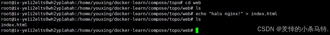 文件挂载:./web:/usr/share/nginx/html — 把本地的 ./web 文件夹作为网站根目录,在里面放网页文件(如 index.html)就能立即生效。