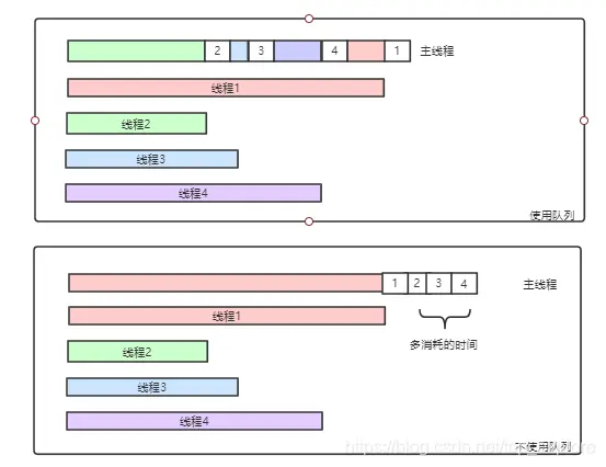 在使用队列的场景下,我们可以在其他任务线程执行的过程中汇总已完成的结果,节省汇总时间。不使用队列的场景下,只用等到当前的线程执行完成才能汇总。
