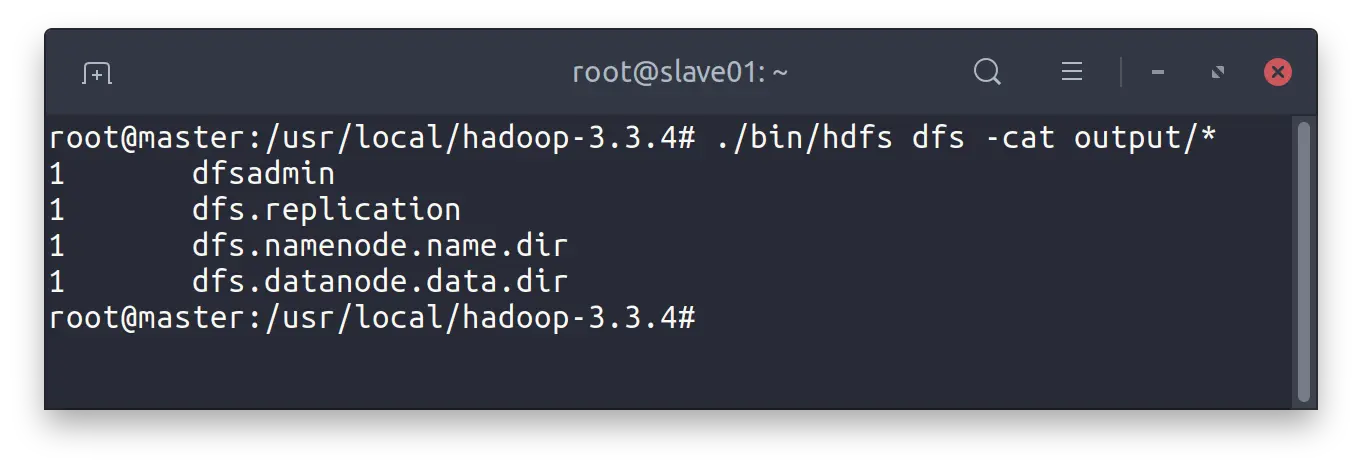 $ ./bin/hadoop jar ./share/hadoop/mapreduce/hadoop-mapreduce-examples-*.jar grep /user/hadoop/input output 'dfs[a-z.]+'