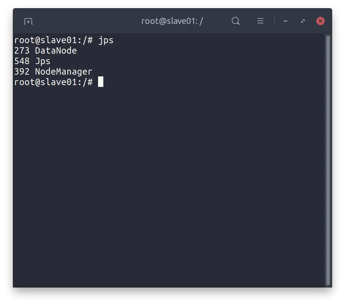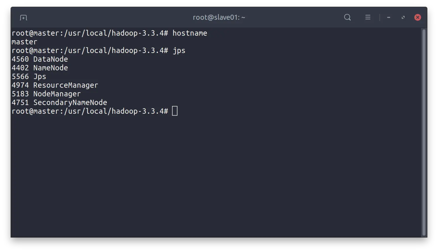 $ docker run -it -h slave01 --name slave01 ubuntu-hadoop:1.0