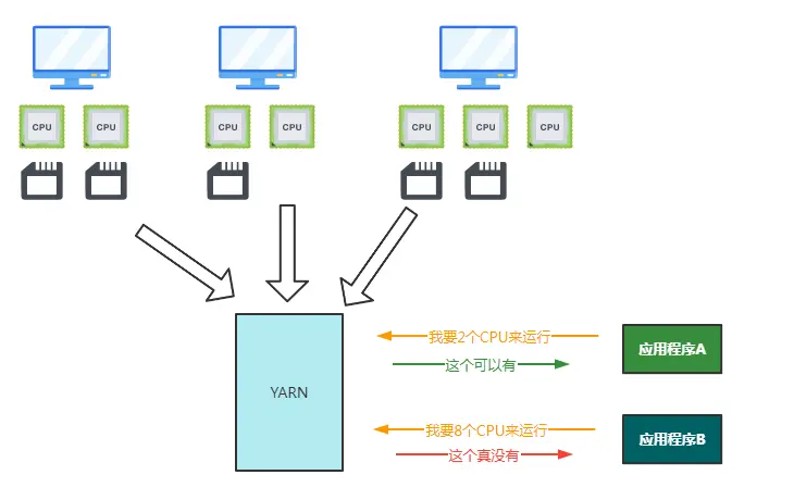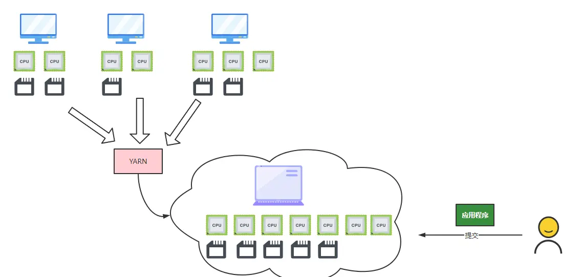 有了yarn提供的庞大的cpu和内存资源,我们就可以把应用程序作业的压力分布在不同计算机上,就解决了大数据的计算难题