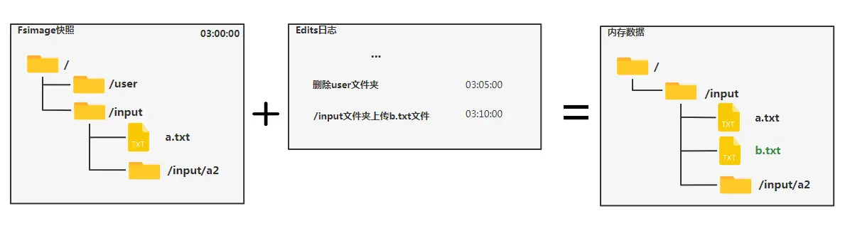 重启时,只需某一时刻的快照Fsimage+之后的Edits文件就可以还原完整数据