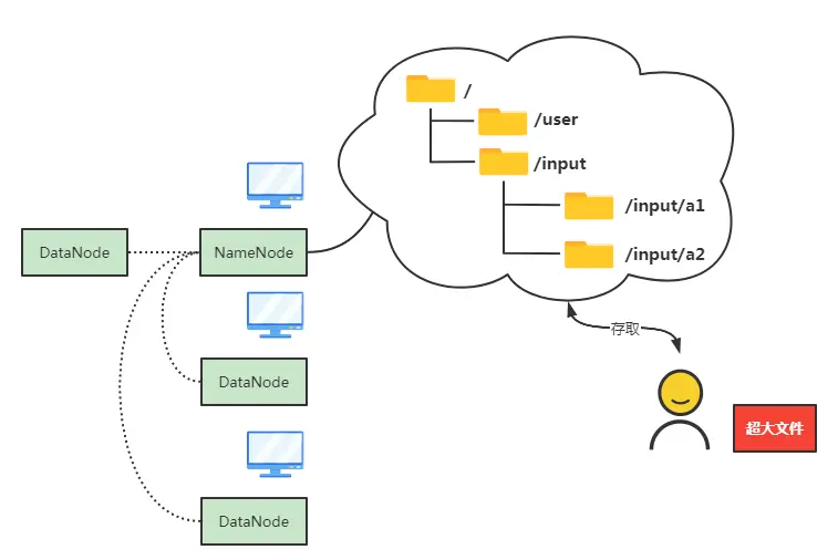 NameNode对外抽象出一个类似linux系统的文件夹,用户存文件时,只需告知存储在哪个文件夹下,NameNode内部会协调具体存在哪个DataNode节点上,取文件同理,只需告知取哪个文件夹下的哪个文件即可