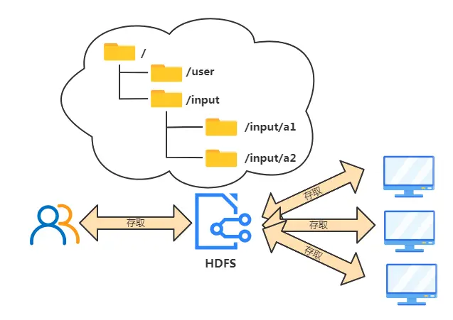 HDFS整合了每台电脑的资源,对外抽象出一个类似linux系统的目录结构,用户使用HDFS只需要像操作单机一样存取文件即可,HDFS内部完成文件的分块、分布式存储等功能,并且还额外提供了自动备份功能防止丢失