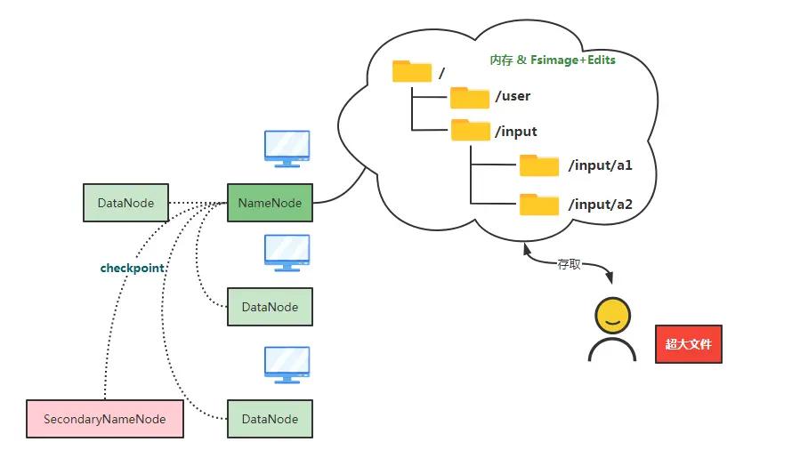 每隔一段时间/日志文件太大情况下,需要生成新的Fsimage快照文件,这个过程叫checkpoint,这个活本该又管理者NameNode来做,但毕竟这个工作量比较负责又涉及磁盘IO,做这些事会耽误NameNode的效率