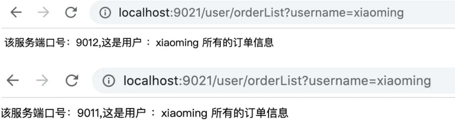 会发现,对订单服务的调用会存在负载均衡,在两个订单服务之间 切来切去。