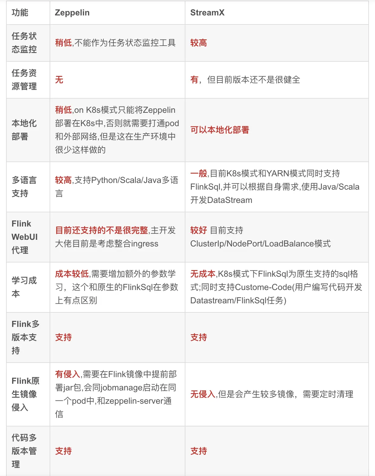 这是个开源兴起的时代,我们自然而然的将目光投向开源领域中,在一众开源项目中,经过对比各个项目综合评估发现Zeppelin和StreamX这两个项目对Flink的支持较为完善,都宣称支持Flink on K8s,最终进入到我们的目标选择范围中,以下是两者在K8s相关支持的简单比较(目前如果有更新,麻烦批评指正)。