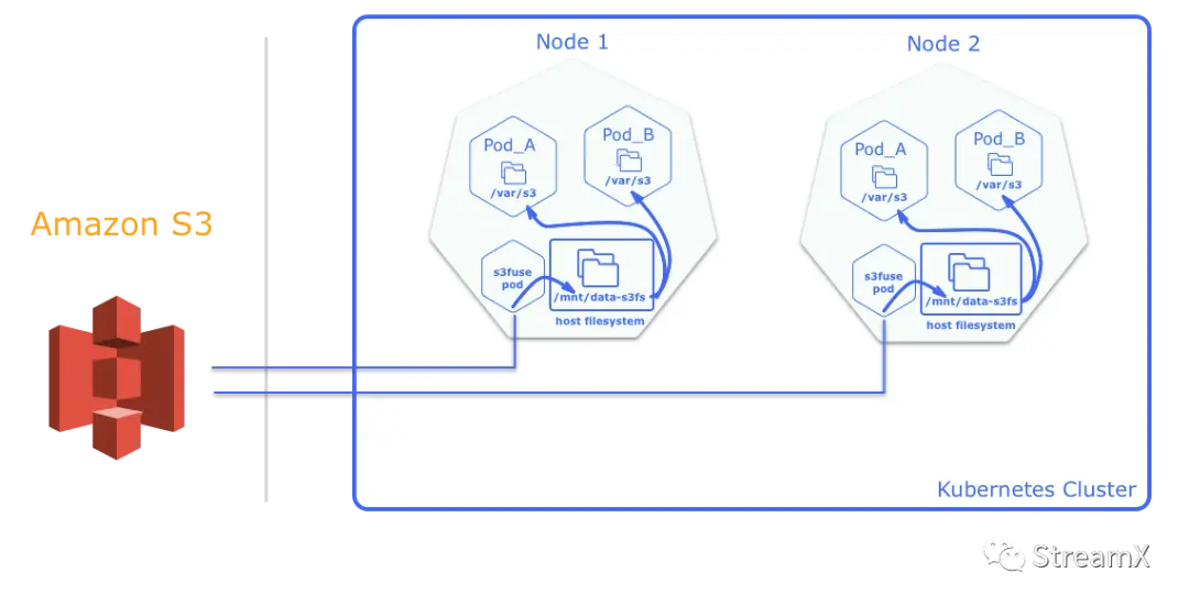 Flink从1.13版本开始,就支持Pod Template,我们可以在Pod Template中利用数据卷挂载的方式再将宿主机目录挂载到每个pod中。从而无需镜像打包而直接在K8s上运行Flink程序。如上图,我们将s3先通过s3-fuse Pod挂载在Node1、Node2的/mnt/data-s3fs目录下,然后再将/mnt/data-s3fs挂载到Pod A中。
