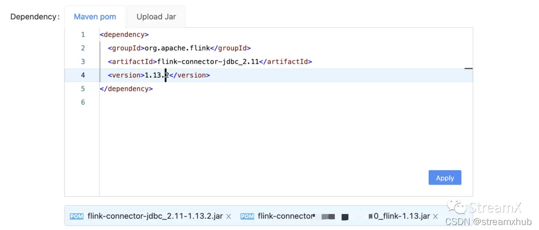 在StreamX中,我们只需要配置相应的参数,并在Maven pom中填写相应的依赖,或者上传依赖jar包,点击Apply,相应的依赖就会生成。这就意味着我们也可以将所有使用的Udf打成jar包 and 各种 connector.jar,直接在sql中使用。如下图:
