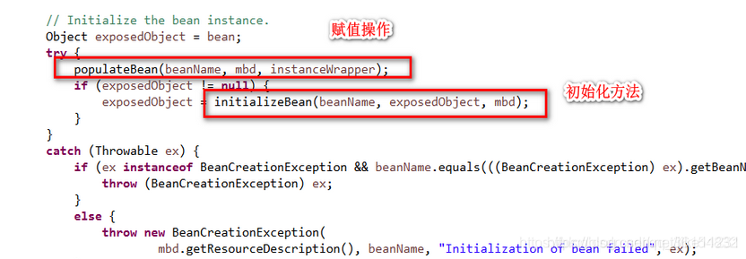 2.调用initializeBean方法,执行后置处理器和指定的初始化方法。(详细过程见下面源码)