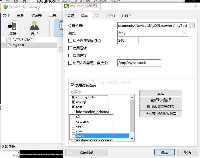 解决过程:开始怀疑是MySQL的权限问题或者是navicat的权限设置问题。问了身边的同事没解决,然后就在网上搜了一番,居然没一个人说清楚的,只能靠自己了。试着在navicat里又建了一个数据库,重启navicat后,又不见了。感觉应该是navicat的设置问题,果然查看连接属性找到问题所在了: