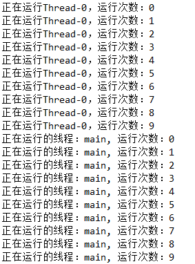1 package com.xyzx.thread; 2 3 public class ThreadDemo extends Thread{ 4 5 public void run(){ 6 Thread thread = Thread.currentThread(); 7 for (int i = 0; i < 10; i++) { 8 System.out.println("正在运行"+thread.getName() + ",运行次数:" + i); 9 } 10 } 11 12 public static void main(String[] args) { 13 ThreadDemo threadDemo = new ThreadDemo(); 14 threadDemo.start(); 15 for (int i = 0; i < 10; i++) { 16 System.out.println("正在运行的线程:" + Thread.currentThread().getName() + ", 运行次数:" + i); 17 } 18 } 19 }