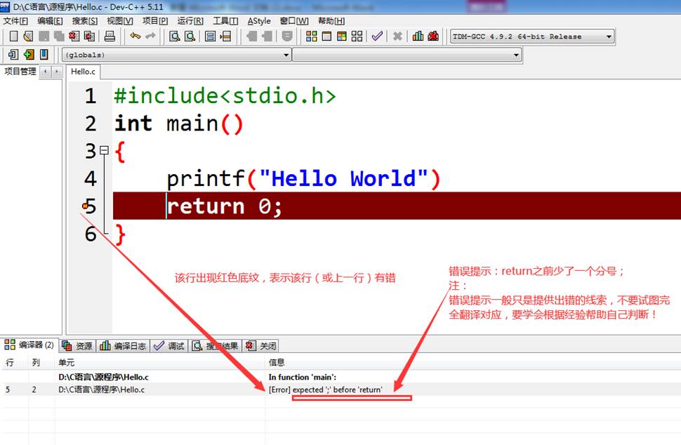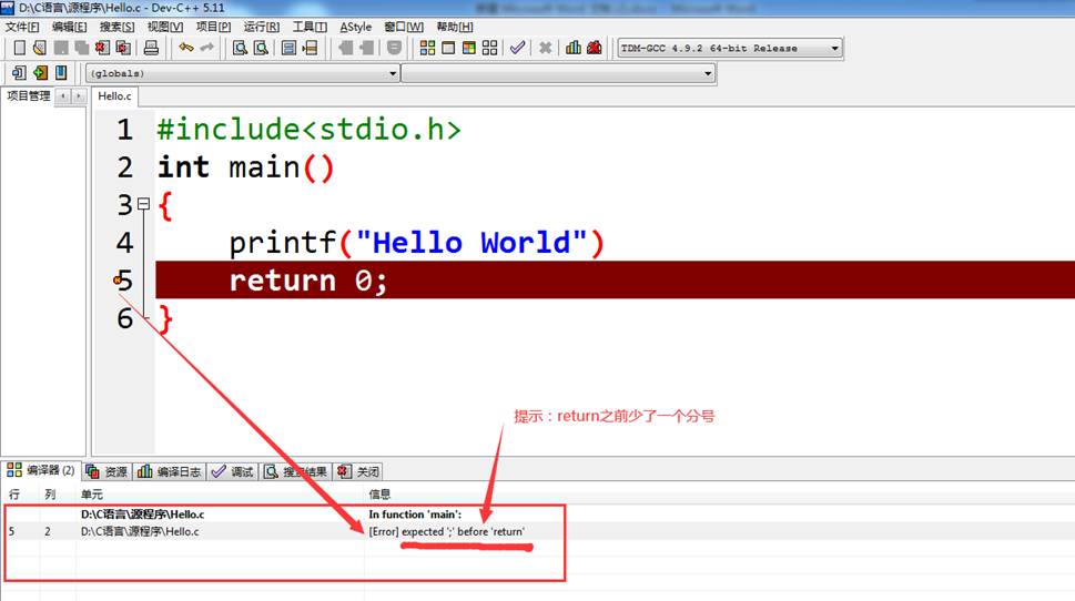 下面是一个编译出错的例子,原因是第四行的末尾少了一个分号: