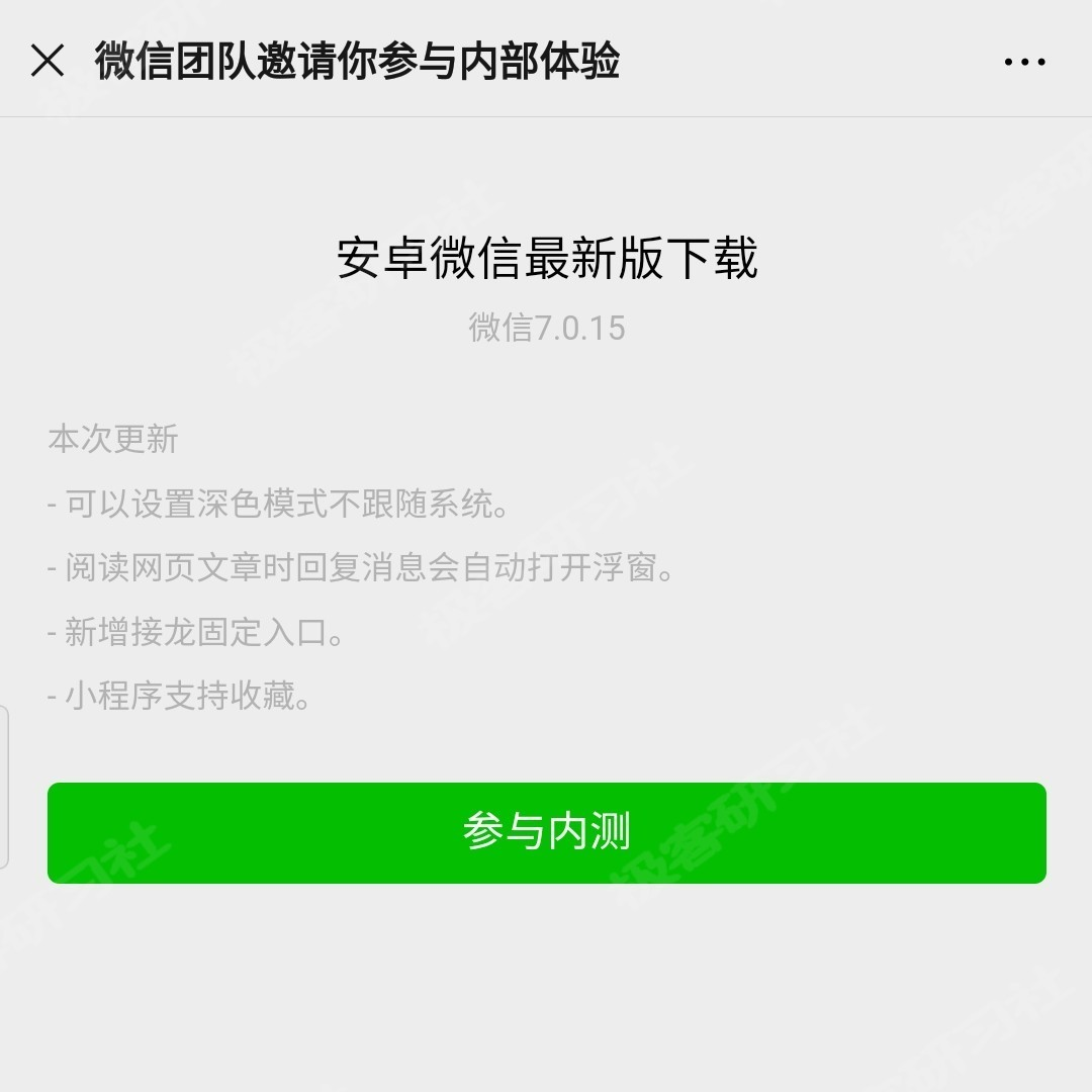 那么,7.0.15更新了哪些内容呢?我们一起来康康~我们先看看官方的更新日志,“可以设置深色模式不跟随系统”、“阅读网页文章时回复消息会自动打开浮窗”“新增接龙固定入口”、“小程序支持收藏”