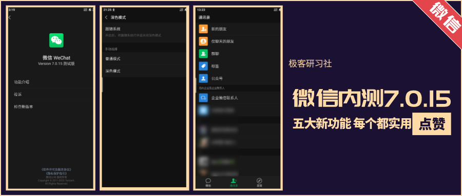 微信7.0.15内测版带来多项实用更新,包括深色模式独立开关、通讯录新增仅聊天的朋友分类、阅读文章时自动开启浮窗、群聊接龙固定入口及小程序支持收藏等功能,大幅提升用户体验。