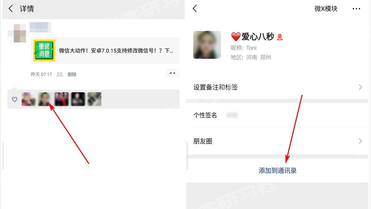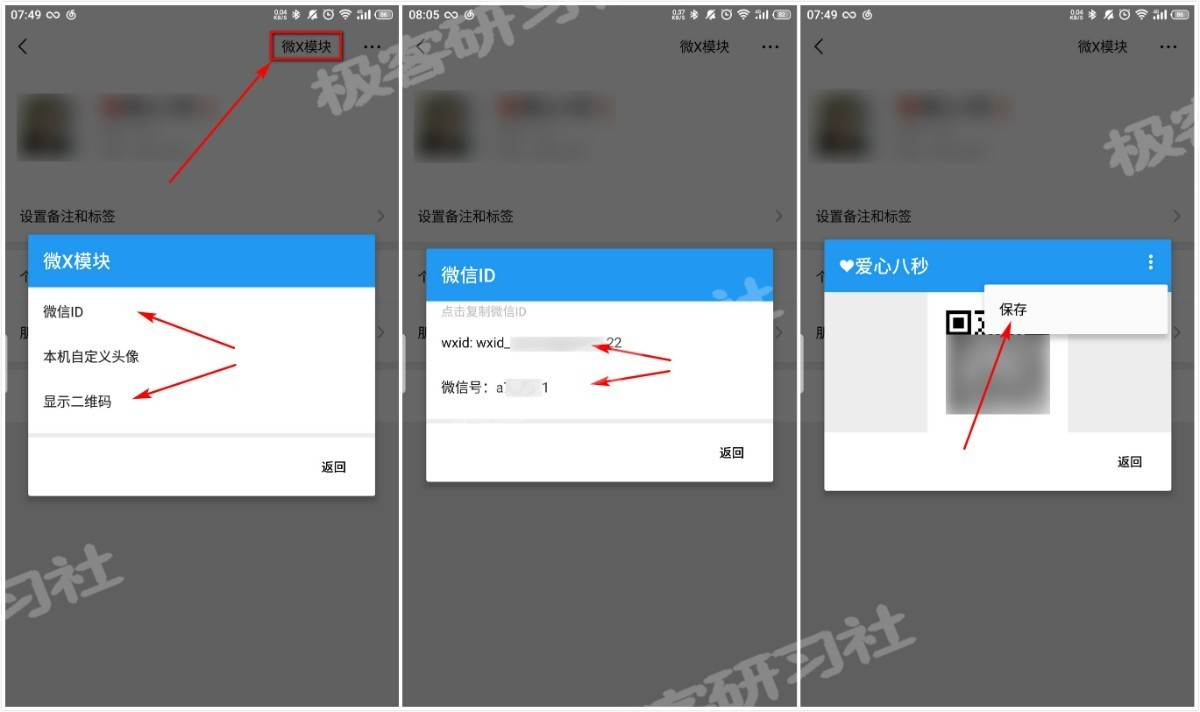当然你也可以使用微X模块的“显示查看微信ID”功能和“显示二维码”功能保存对方的微信ID(wxid和微信号)以及二维码!