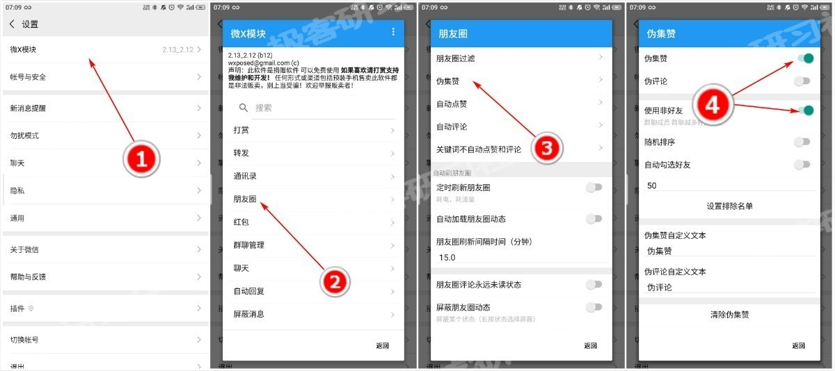 太极和微X安装成功以后,我们在设置中打开微X模块,进入微X模块菜单界面,依次打开朋友圈-伪集赞,将伪集赞功能打开,并打开“使用非好友”选项