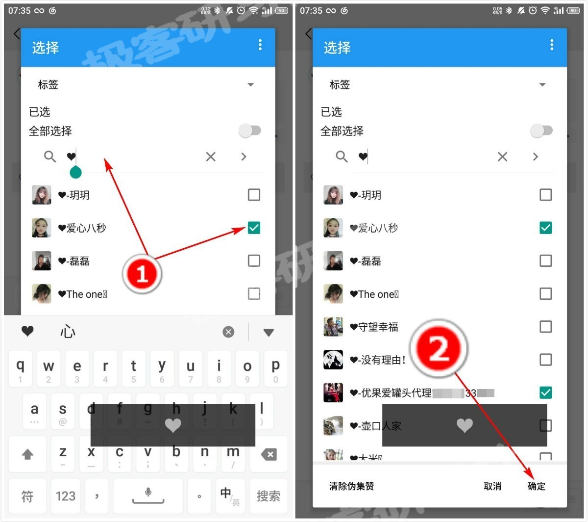 长按伪集赞以后,在弹出窗口搜索你需要找回删除的微信好友的昵称或者备注,找到并勾选,然后点击右下角的确定~