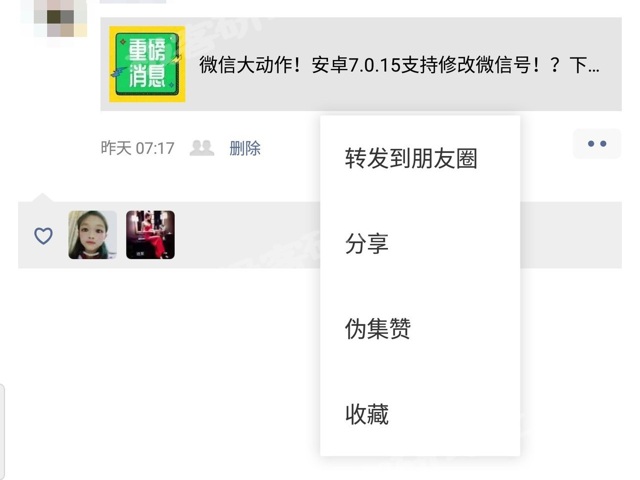 按照上述步骤打开相关功能后,我们进入朋友圈,随便选择一个动态(自己的和他人都可以),长按选择“伪集赞”