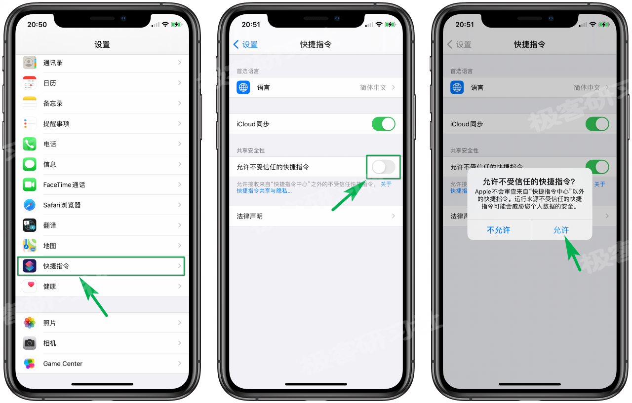 然后打开手机设置找到“快捷指令”,将“添加不受信任的快捷指令”的开关打开,这样才可以添加下面要使用的快捷指令!
