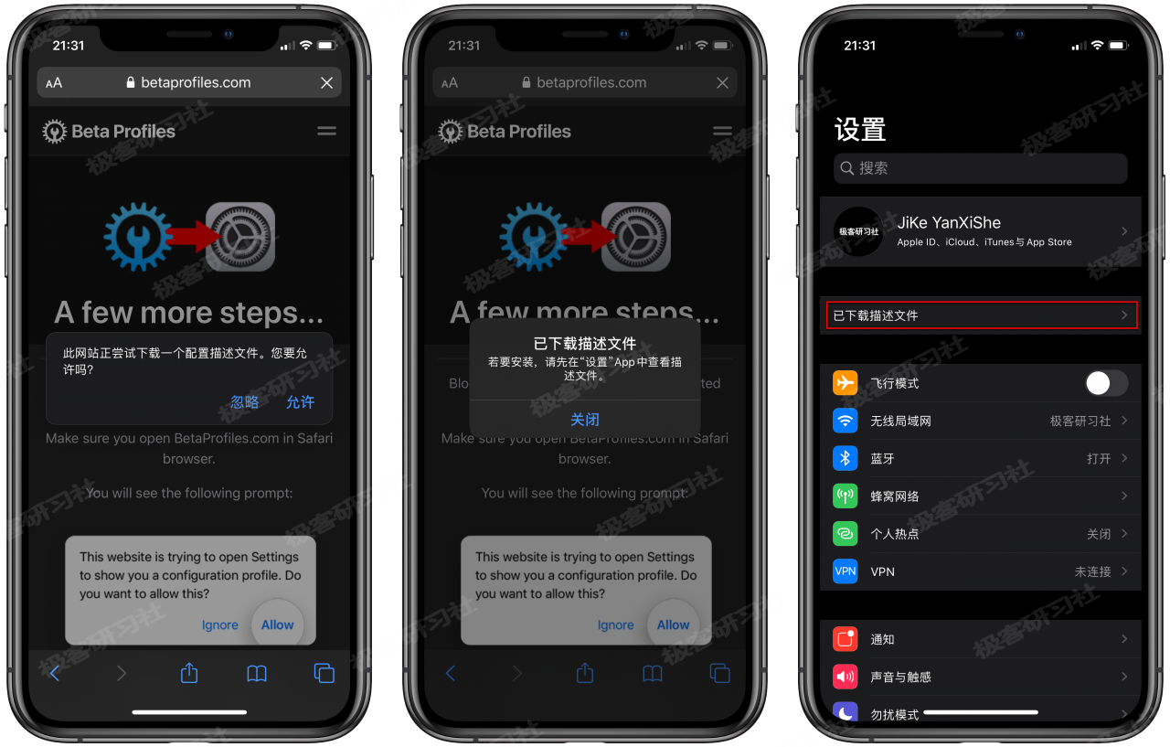 这时会重新打开一个网页和下载弹窗提示,我们选择“允许”而不是“忽略”,不用等待就会秒下载完成!下载完成以后,我们打开设置,就可以看到 Apple ID 头像下方有一个“已下载描述文件”