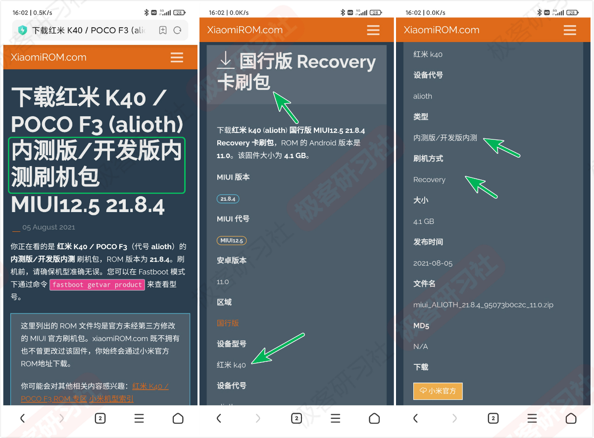 我们用手机浏览器打开网站, 首先找到与自己手机型号对应的内测刷机包。手机型号一定要搞对,千万不要搞错,否则可能会变砖。比如红米 K40 与红米 K40 增强版是不一样的。