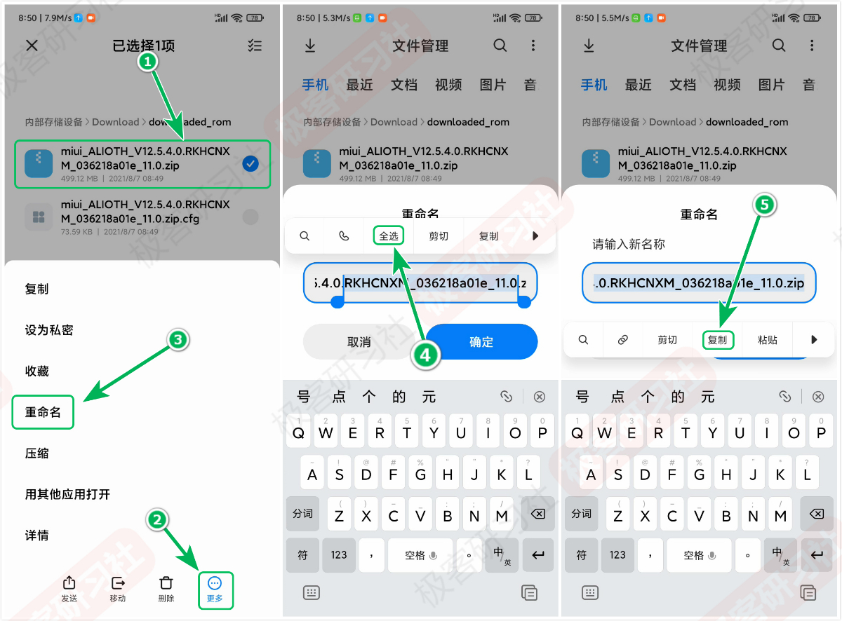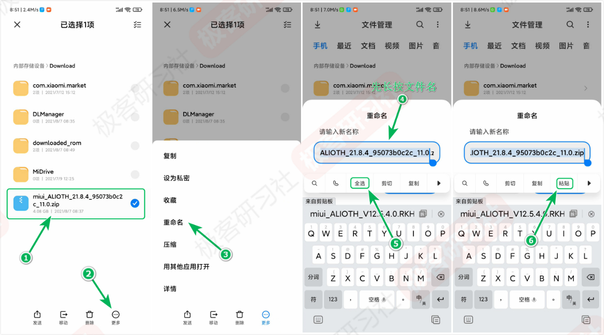 接下来,我们返回到上级目录,也就是 Download 文件夹,找到上一步已经下载好的内测刷机包,选中然后点击右下角“更多”菜单选择“重命名”,然后长按文件名全选,再粘贴,确定完成重命名。