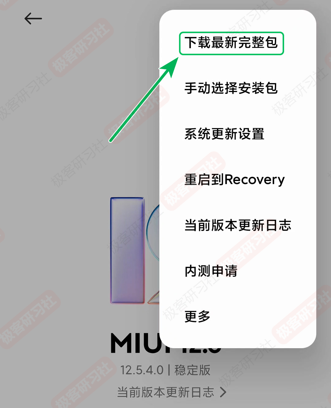 在内测刷机包下载完以后,我们下载当前系统的完整包。具体方法:打开设置,点击“我的设备”再点击“MIUI 版本”进入版本详情页面,点击右上角三个点,选择“下载最新完整包”下载即可。