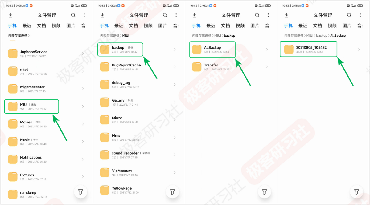 备份完成以后,我们打开文件管理,在手机根目录依次打开“MIUI”-“backup”-“AllBackup”文件夹,以最新日期命名的文件夹就是刚刚备份好的数据,我们可以发送到电脑保存一份,以防万一。