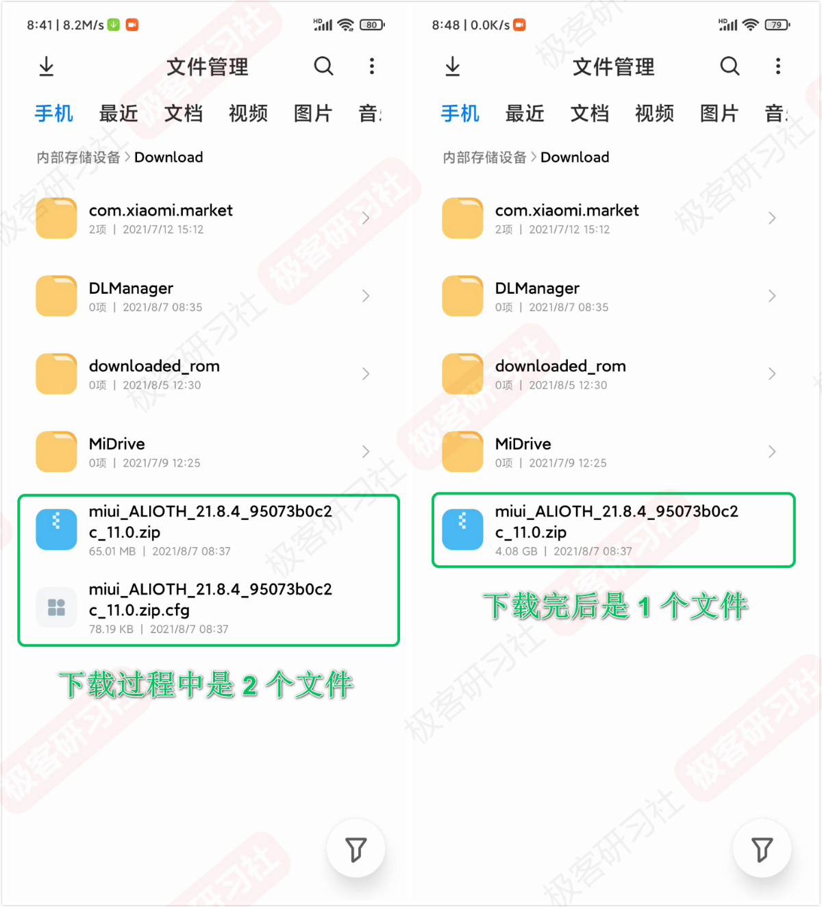 首先,就是重命名文件,只有同名同类型文件才能覆盖替换。我们打开文件管理,进入手机根目录 Download 文件夹,再打开目录下的 downloaded_rom 文件夹,这里的两个文件就是正在下载的当前系统的完整包。