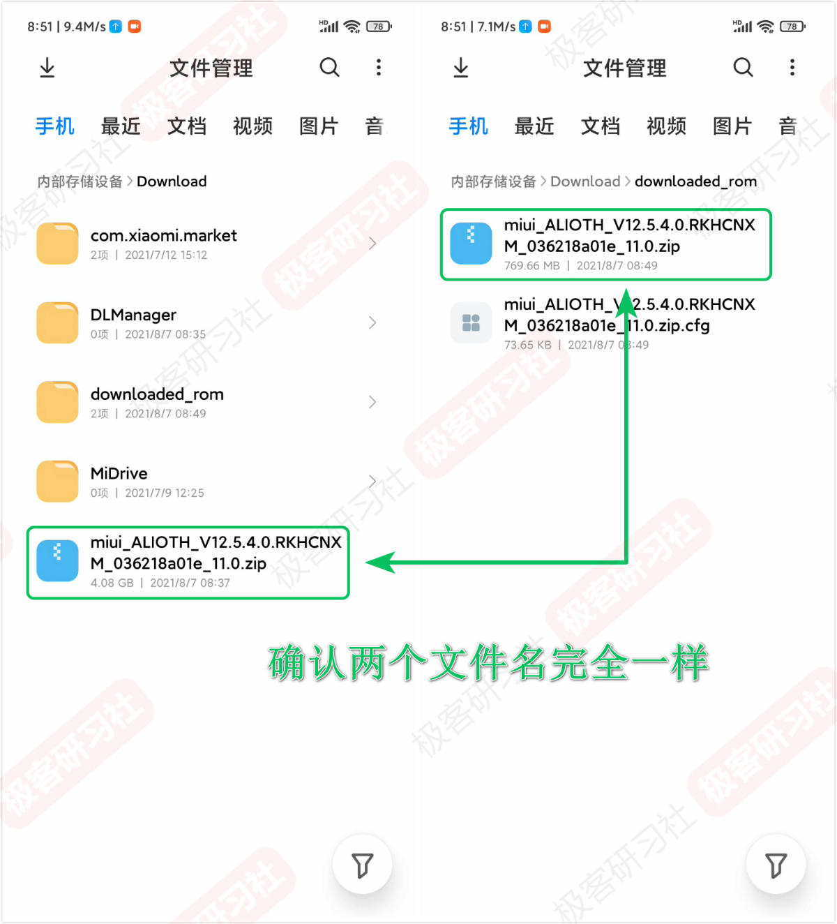 重命名后,再检查一下文件名,确认 Download 文件夹下内测刷机包文件名与 downloaded_rom 文件夹下正在下载的系统完整包文件名一样。