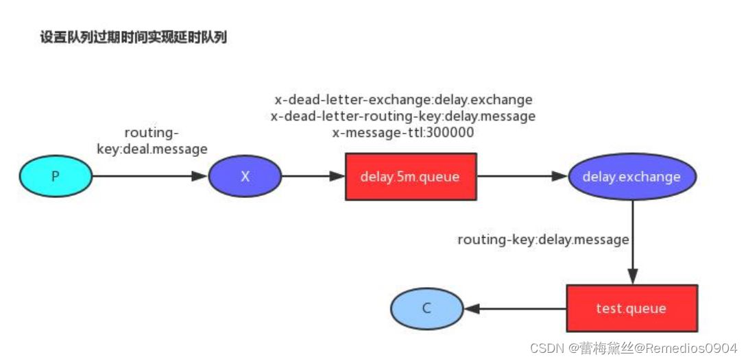 该队列设置消息存活时间是5分钟 到期转发给指定的路由件delay.exchange 消息的key是delay.message