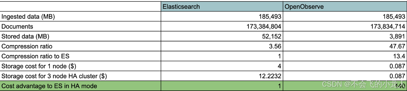 通过使用 OpenObserve,与 Elasticsearch 相比,您可以将日志存储成本降低约 140 倍。以下是我们使用 fluentbit 将日志从生产 kubernetes 集群推送到 Elasticsearch 和 OpenObserve 时的结果。OpenObserve 将数据存储在 Amazon s3 中,而 Elasticsearch 将数据存储在 Amazon EBS 卷上。