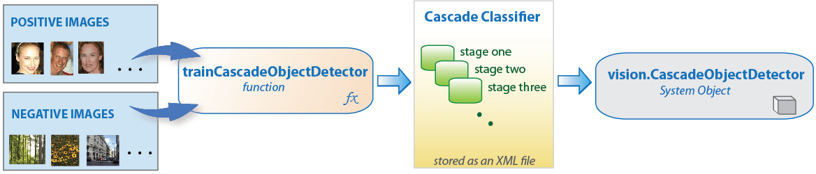 The vision.CascadeObjectDetector System object comes with several pretrained classifiers for detecting frontal faces, profile faces, noses, upperbody, and eyes. However, these classifiers may not be sufficient for a particular application. Computer Vision System Toolbox™ provides the trainCascadeObjectDetectorfunction to train a custom classifier.