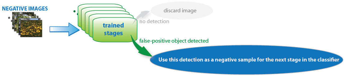 Just as with positive samples, there is no guarantee that the calculated number of negative samples are always available for a particular stage. The trainCascadeObjectDetector function generates negative samples from the negative images. However, with each new stage, the overall false alarm rate of the cascade classifier decreases, making it less likely to find the negative samples.