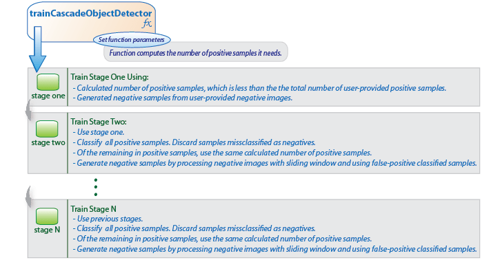 Cascade classifier training requires a set of positive samples and a set of negative images. You must provide a set of positive images with regions of interest specified to be used as positive samples. You can use the trainingImageLabeler app to label objects of interest with bounding boxes. The app outputs an array of structs to use for positive samples. You also must provide a set of negative images from which the function generates negative samples automatically. Set the number of stages, feature type, and other function parameters to achieve acceptable detector accuracy.