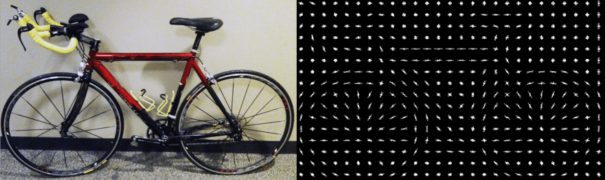 Choose the feature which suits the type of object detection you need. The trainCascadeObjectDetectorsupports three types of features: Haar, Local Binary Patterns (LBP), and Histograms of Oriented Gradients (HOG). Historically, Haar and LBP features have been used for detecting faces. They work well for representing fine-scale textures. The HOG features have been used for detecting objects such as people and cars. They are useful for capturing the overall shape of an object. For example, in the following visualization of the HOG features, you can see the outline of the bicycle.