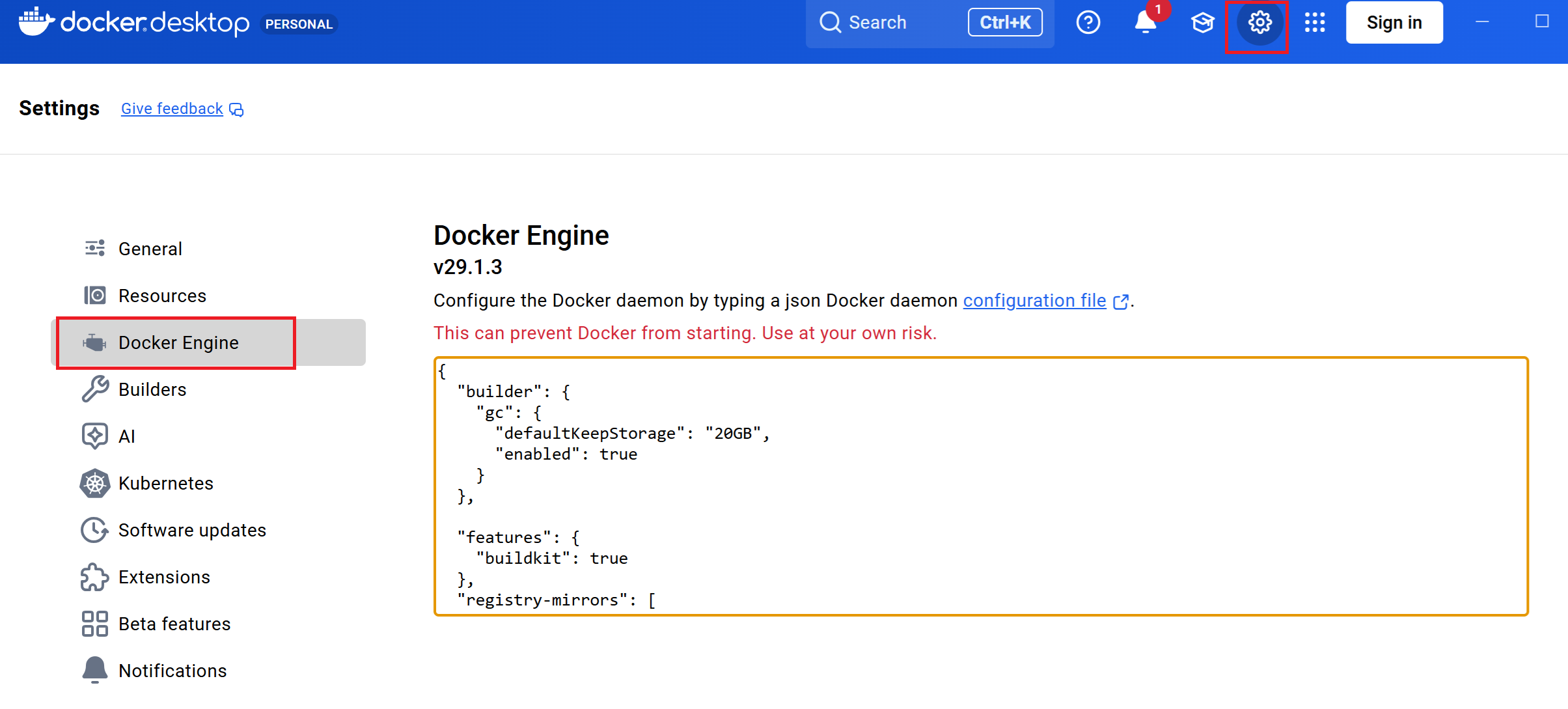 打开Docker的UI,在Setting-> Docker Engine,将输入框的内容改为如下: