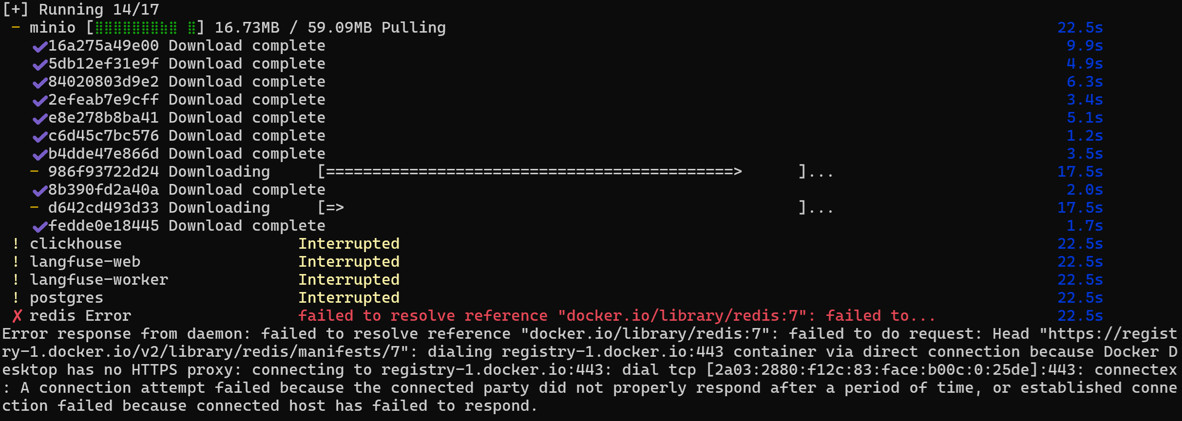 “Error response from daemon: failed to resolve reference "docker.io/library/redis:7": failed to do request: Head "https://registry-1.docker.io/v2/library/redis/manifests/7": dialing registry-1.docker.io:443 container via direct connection because Docker Desktop has no HTTPS proxy: connecting to registry-1.docker.io:443: dial tcp [2a03:2880:f12c:83:face:b00c:0:25de]:443: connectex: A connection attempt failed because the connected party did not properly respond after a period of time, or established connection failed because connected host has failed to respond.”