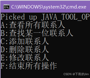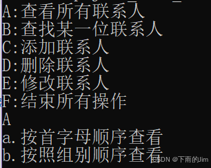 System.out.println("A:查看所有联系人\nB:查找某一位联系人\nC:添加联系人\nD:删除联系人\nE:修改联系人\nF:结束所有操作");