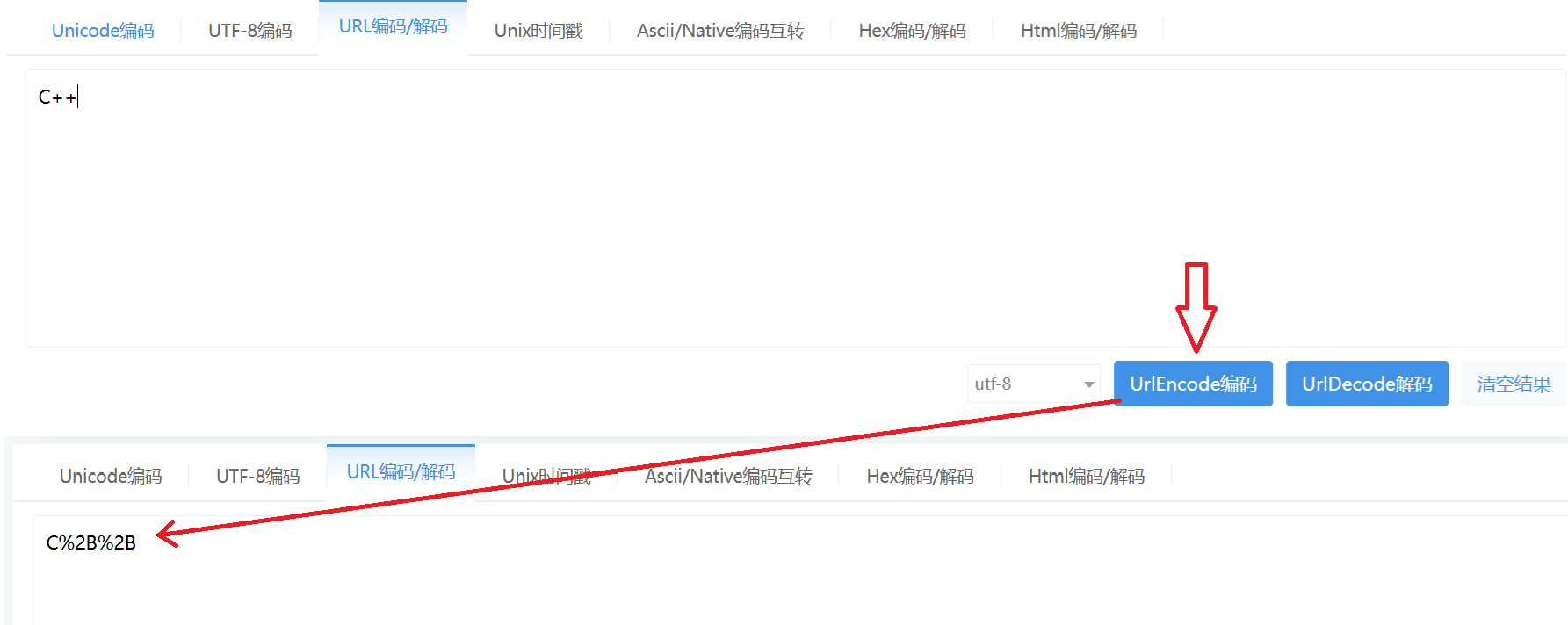 选中其中的URL编码/解码模式,在输入C++后点击编码就能得到编码后的结果。