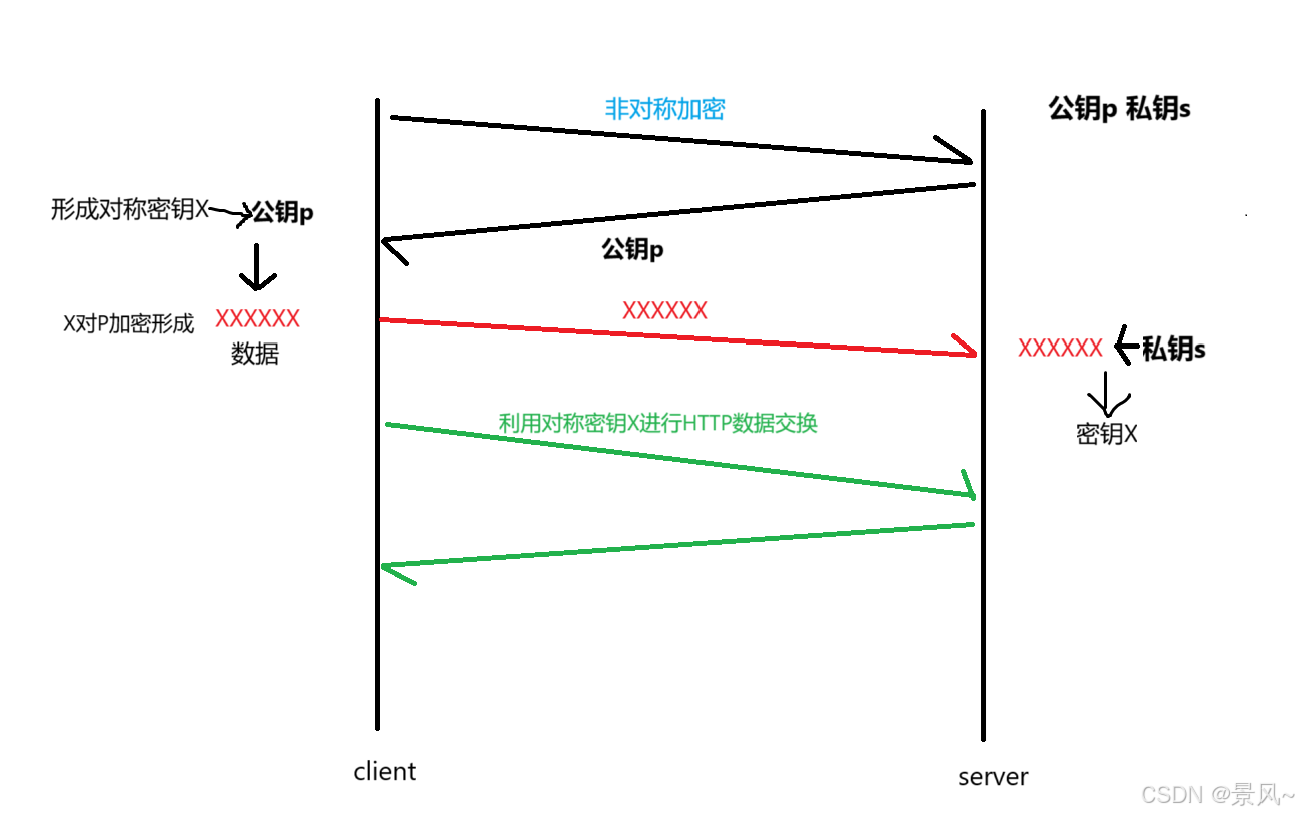 - 客户端在本地生成对称密钥X,通过公钥P加密,发送给服务器.