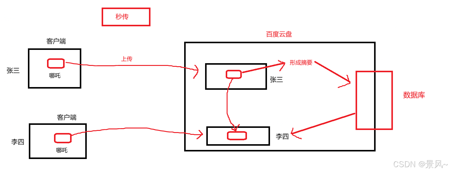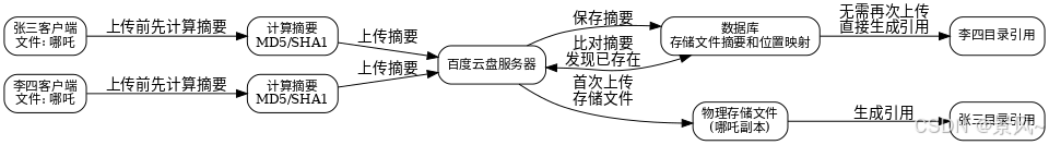 有一天李四也要上传哪吒,当他上传时服务器也会扫描一遍文件形成摘要然后和数据库中的海量摘要区匹配,如果两个摘要相同表示二者是同一文件,云盘便会把张三的那份哪吒直接拷贝到李四的云盘里,这就是秒传的原理