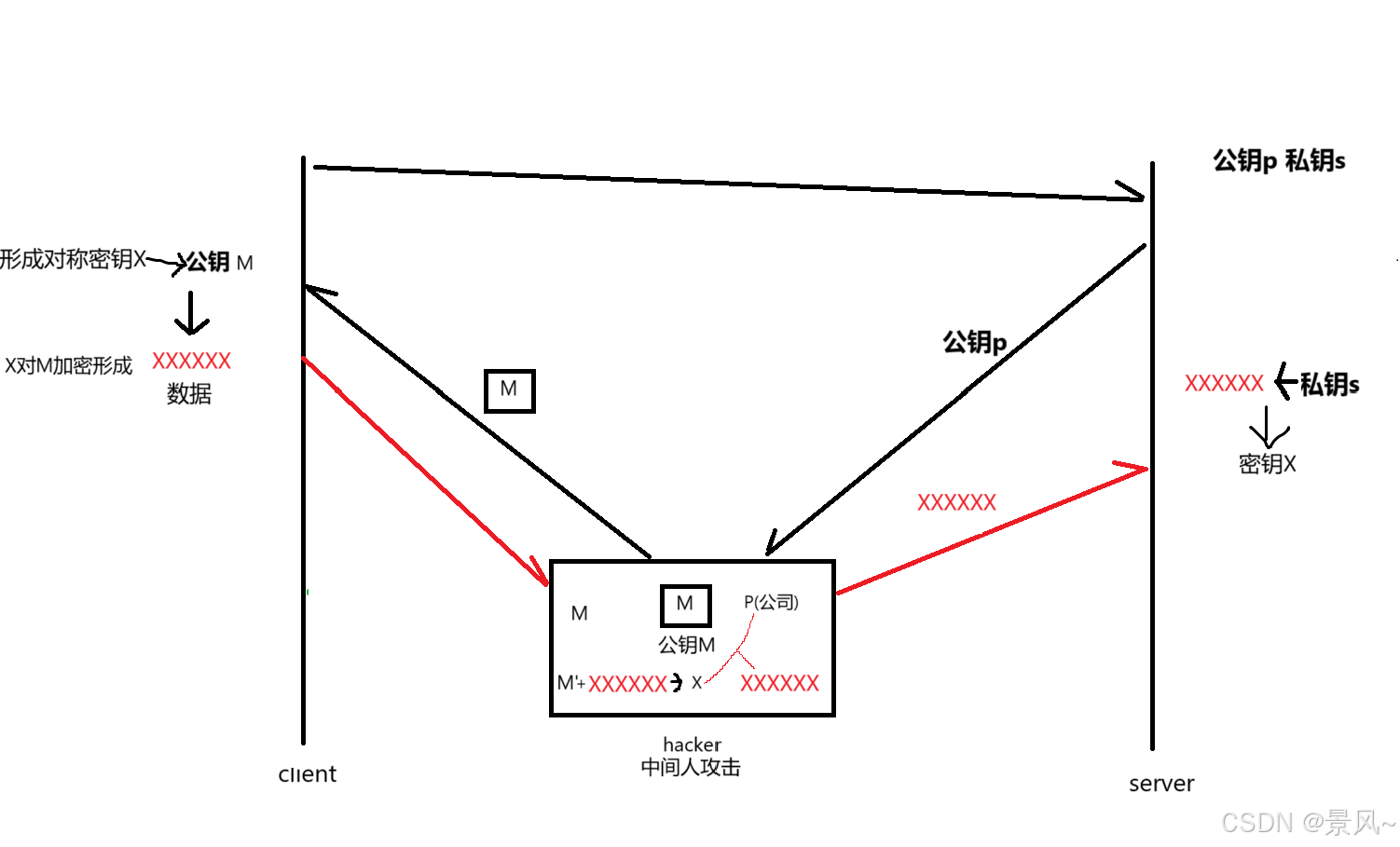 - 客户端收到报文,提取公钥M(自己当然不知道公钥被更换过了),自己形成对称秘钥X,用公钥M加密X,形成报文发送给服务器