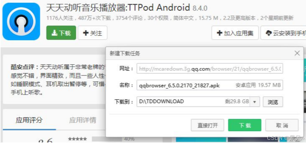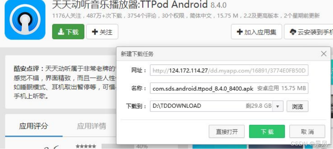 下载一个天天动听 未被劫持的效果,点击下载按钮,就会弹出天天动听的下载链接