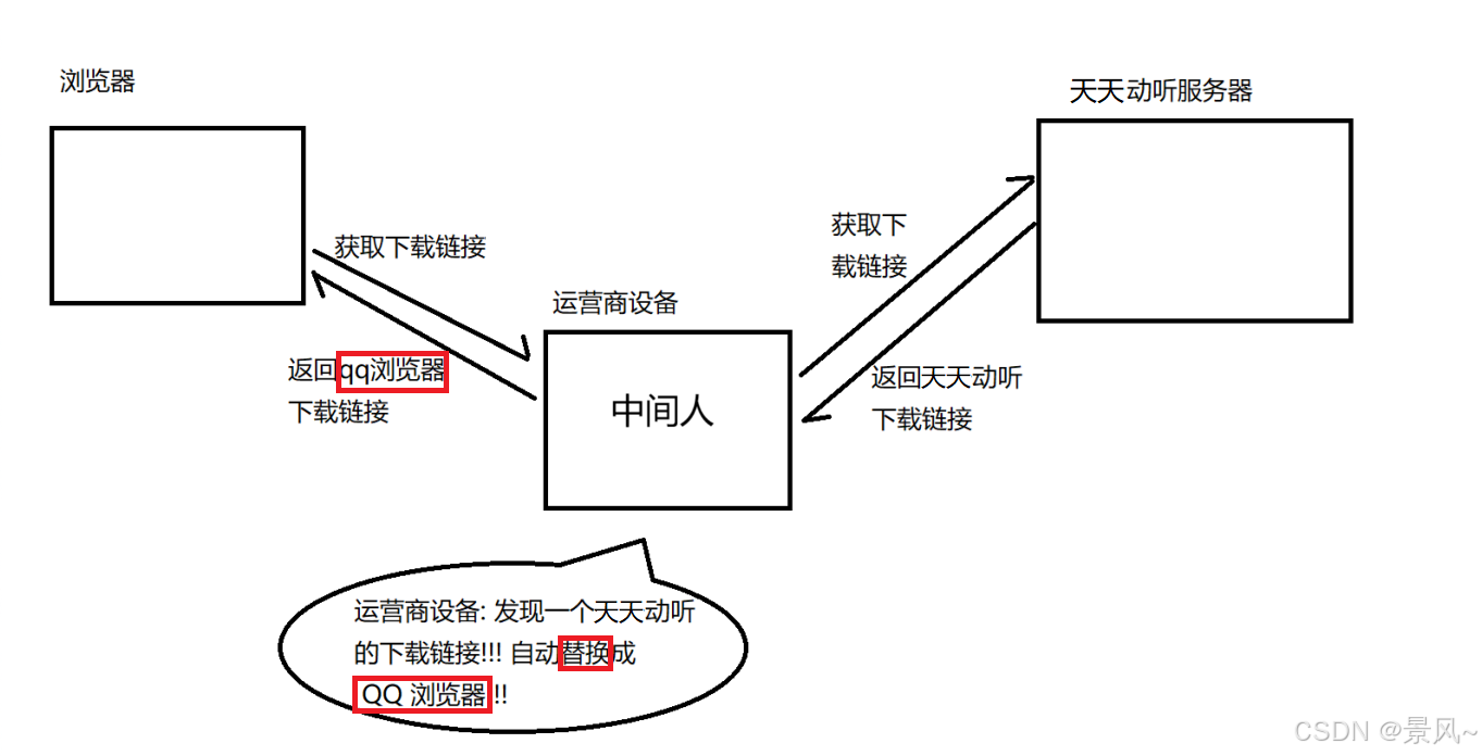 点击"下载按钮",其实就是在给服务器发送了一个HTTP请求,获取到的HTTP响应其 实就包含了该APP的下载链接.运营商劫持之后,就发现这个请求是要下载天天动听, 那么就自动的把交给用户的响应给篡改成"QQ浏览器"的下载地址了.