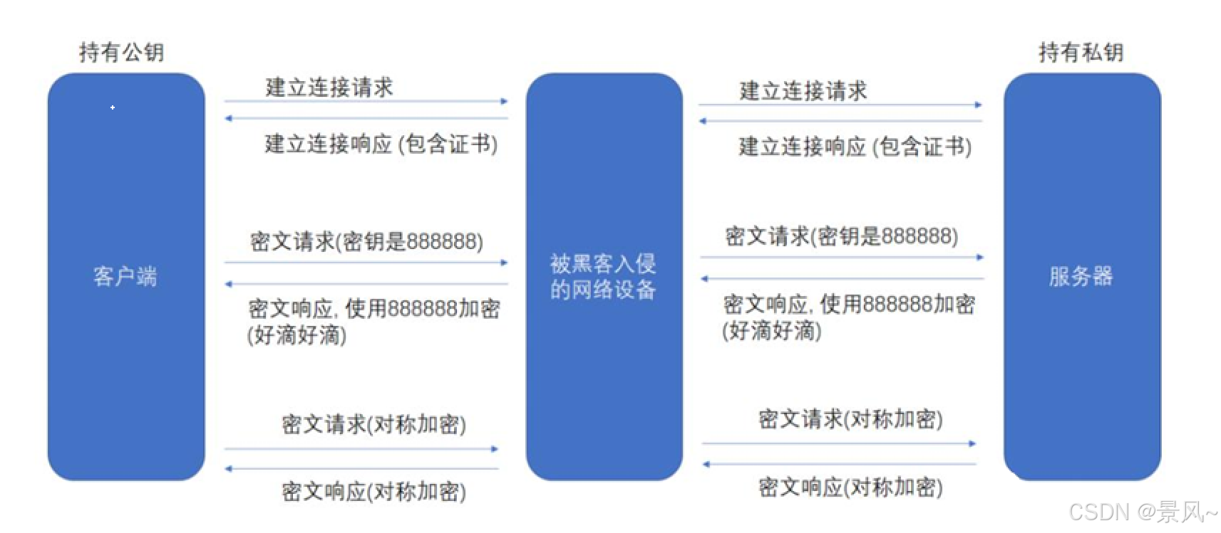 - 由于中间的网络设备没有私钥,即使截获了数据,也无法还原出内部的原文,也就 无法获取到对称密钥(真的吗?)